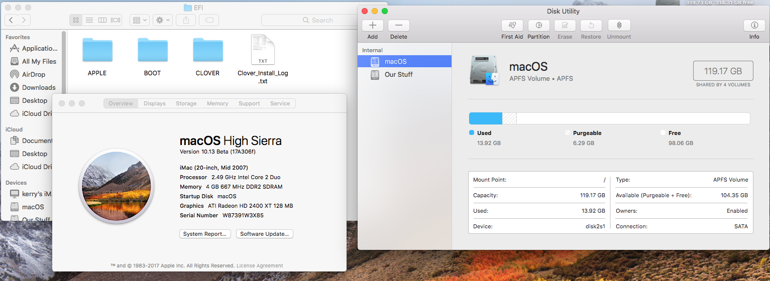 Once this is done I change the smbios back to exactly what my iMac really is, a 2007 20" iMac. Except for the Bios Release Date, that has to be to the date used in this thread. You can use Terminal to find your product name, board-id and serial. then use about this Mac to find your serial number and uuid. That why everything will work on your Mac like it is suppose to. When I have a 2013 smbios only one of my usb works. Unless I added kext and other things like on a hackintosh. But for this purpose you just need your Mac to work just enough to get High Sierra downloaded and installed.