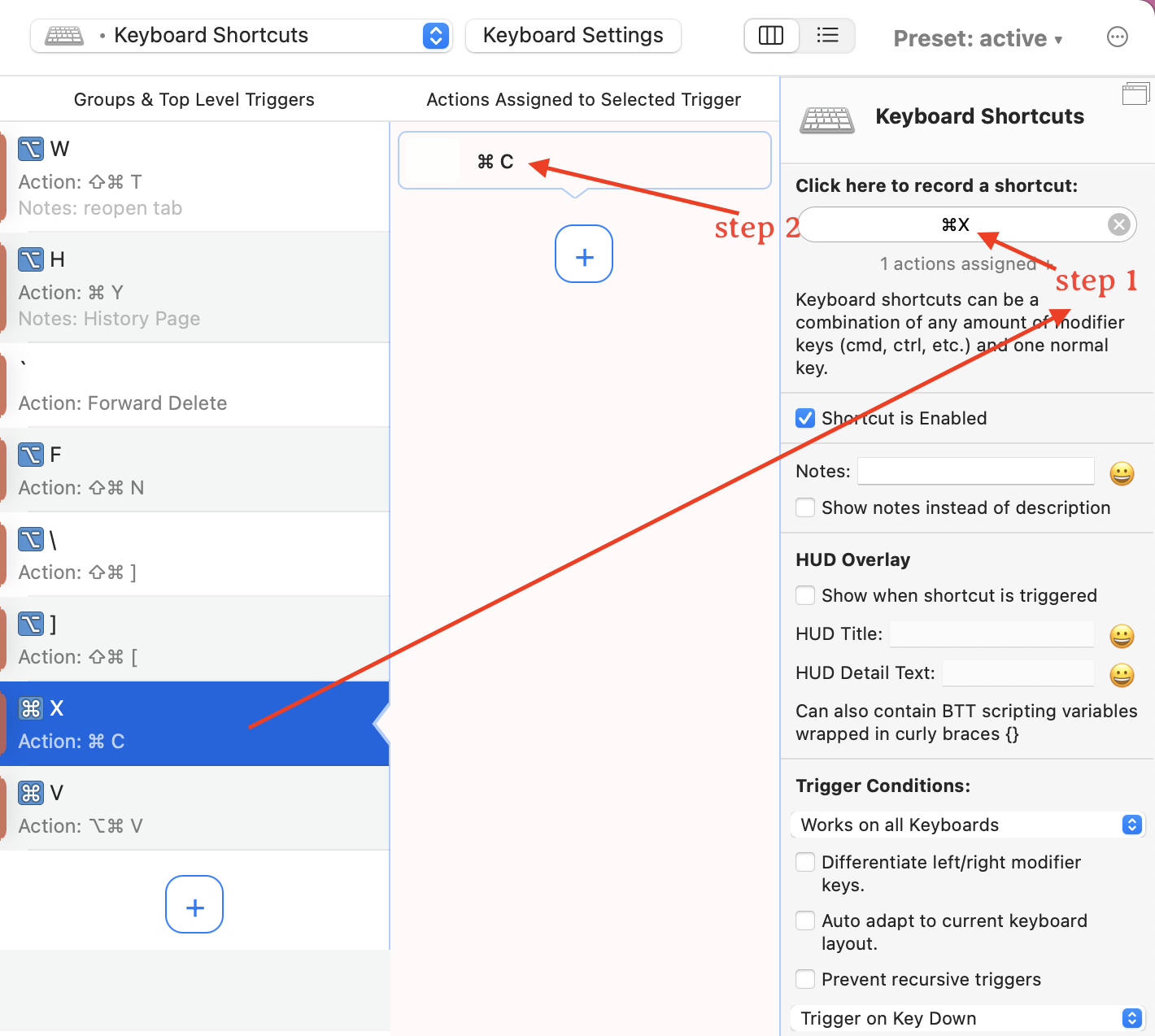 - remap keyboard input CMD-X to CMD-C (this is somewhat moot other than just to imitate ctrl-x)