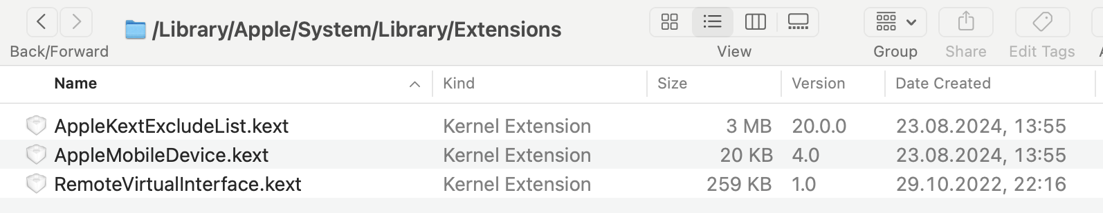 I don't know what these are for. I have 2 AppleMobileDevice.kext files on my machine. One in /Library/Extensions dated Aug 21, 2019 version 4.0 and another one in /Library/Apple/System/Library/Extensions dated Aug 27, 2024 version 4.0.Do you know what this extension is for?