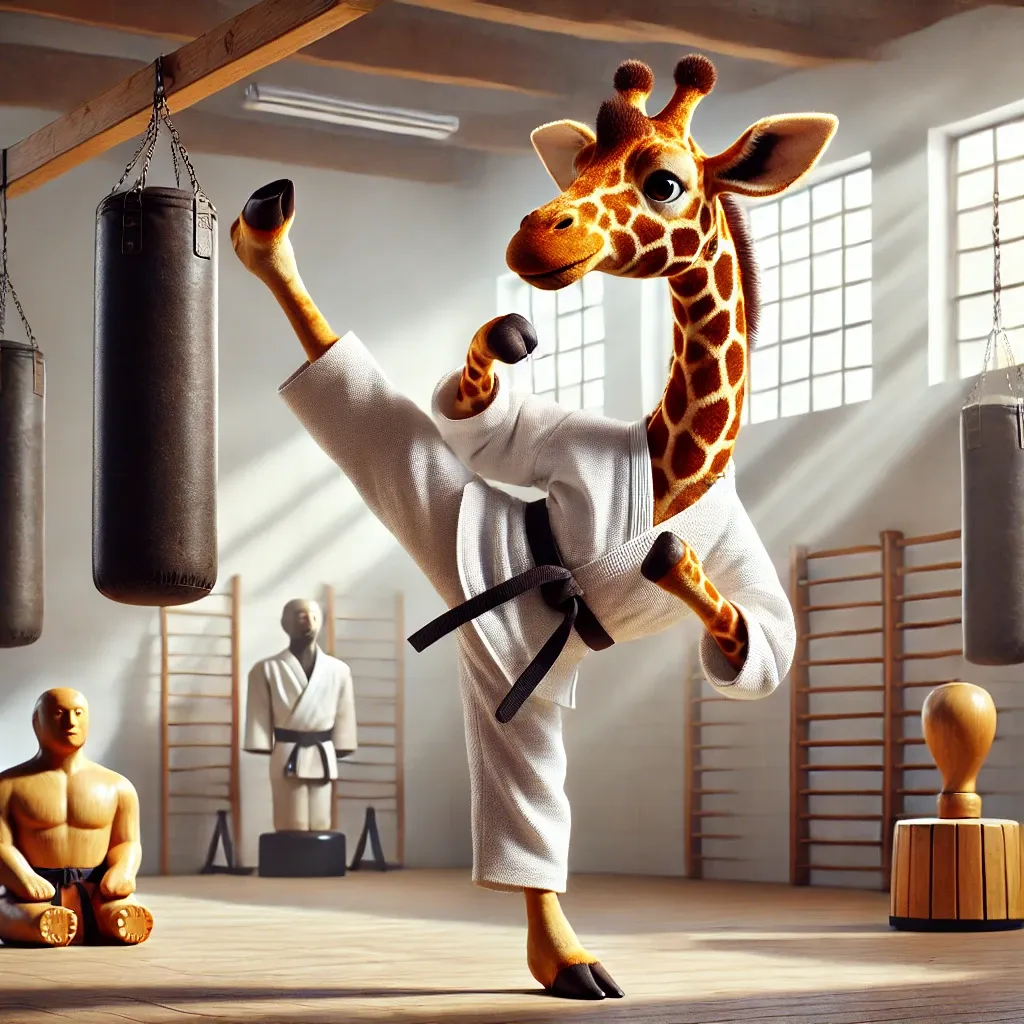 Here is a photorealistic image of a giraffe performing karate, captured in a natural savanna setting with its dynamic pose and attention to realistic detail. 🦒🥋