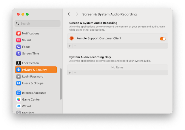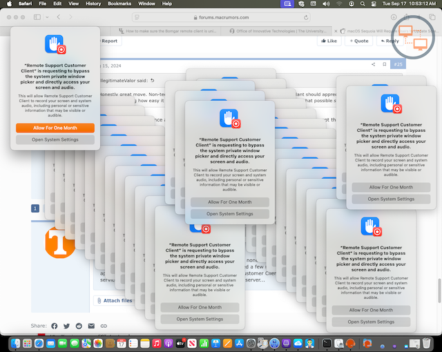 I am spammed with endless dialogs giving me two options, none of which allow me to "finalize" my settings so that the damn popups finally go away for good. This was experienced a few minutes ago on macOS Sequoia 15.0. The application I was trying to approve — is Remote Support Customer Client (aka "Bomgar"). I hadn't even pinned the Jump client yet. As soon as I toggled the slider on for 'Remote Support Customer Client' in System Settings > Privacy & Security > Screen & System Audio Recording, I started getting spammed with the popups (see attached screenshot). I had to Force Quit Remote Support Customer Client to put a temporary end to the incessant popups. I entered my password to confirm the change, and that was that...or so I thought. I am still getting the popup every few minutes. It doesn't seem to 'remember' my initial selection of "Allow For One Month".