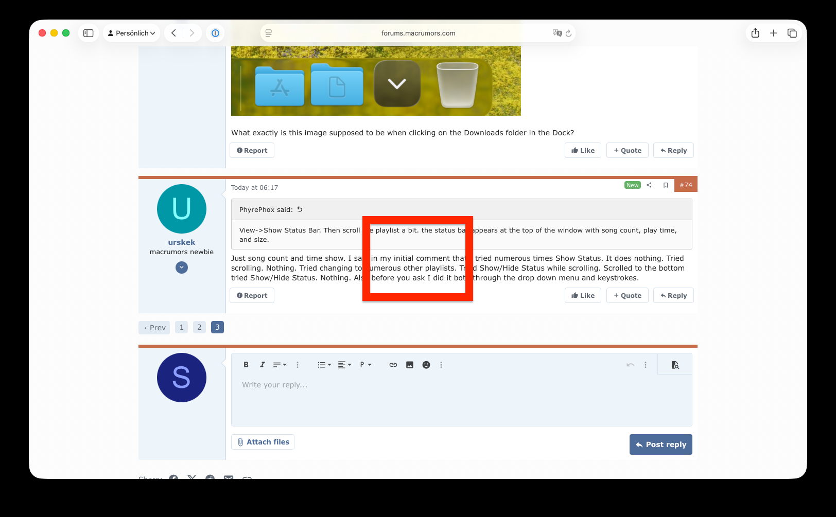 Just song count and time show. I said in my initial comment that I tried numerous times Show Status. It does nothing. Tried scrolling. Nothing. Tried changing to numerous other playlists. Tried Show/Hide Status while scrolling. Scrolled to the bottom tried Show/Hide Status. Nothing. Also before you ask I did it both through the drop down menu and keystrokes.View->Show Status Bar. Then scroll the playlist a bit. the status bar appears at the top of the window with song count, play time, and size.