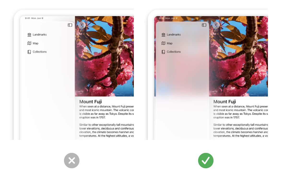 Apple has shown this "background extension effect" for macOS in one of the developer videos. They do seem to encourage it at least for apps that fill the window with artwork:But now, where possible, Apple is encouraging actual window content behind the sidebar. Obviously obscuring your own content would be bad, so they're literally going out of their way with programmatic hacks, like this iPadOS example where the system will dynamically mirror and blur the content to extend behind the sidebar. (This example is on an iPad, but the effect "backgroundExtensionEffect()" is available for all platforms, interestingly.