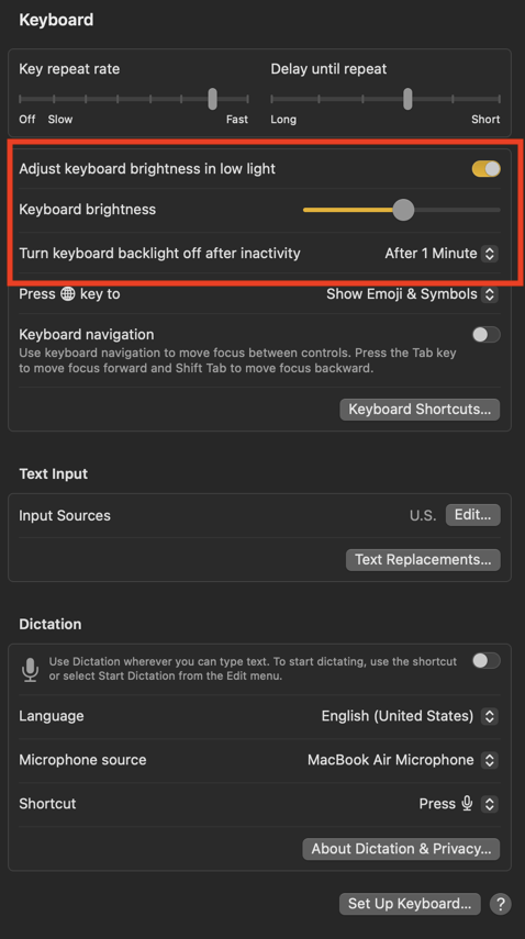 Well, the thing is that "system settings>keyboard (re: the backlight)..." is not available under the keyboard settings! Unfortunately this MacBook Pro is my only mac with Ventura. I can see in an Macbook Air (2013 running Big Sur) that there is a setting called "Adjust keyboard brightness in low light", but again, this setting is not available in 13.2.1.check (or try changing) some of the settings in system settings>keyboard (re: the backlight)...