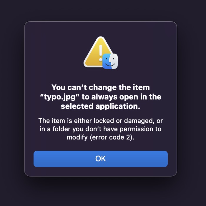 I did a “Get Into” on a random JPG file on my Desktop, and when I clicked the “Use this application to open all documents like this one” button, I got this error message: