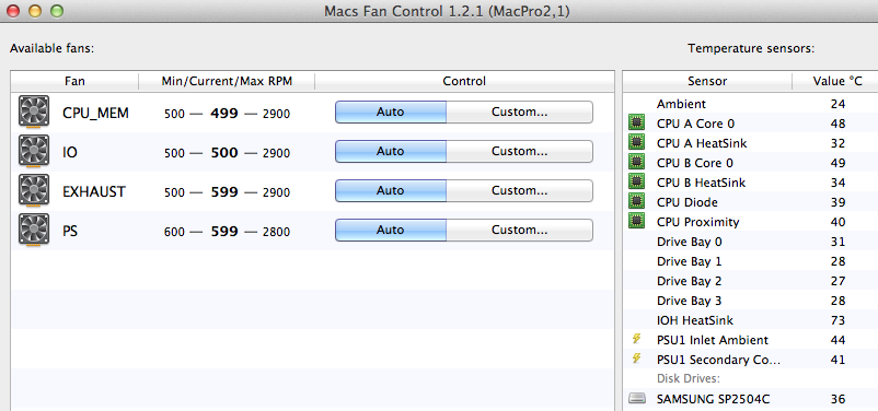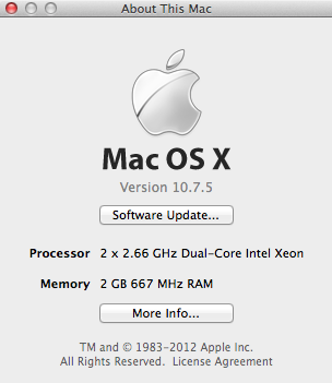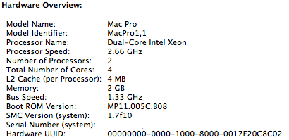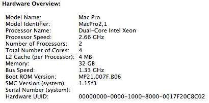 MacPro 2,1 with total of 8 cores running at 3,0GHz and total of 32 GB RAM
