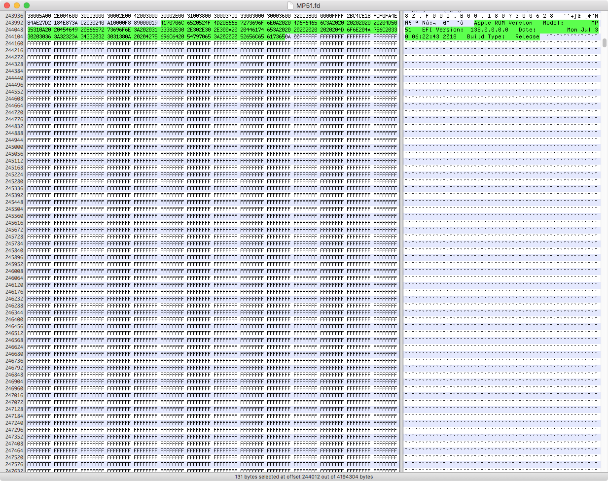 If I get the MP6,1 ROM dump, I'll decompress the hardware descriptor from the private part of the NVRAM and add another four ports to the MP5,1 one, for the FL1100 chipset, with the same syntax used in the trashcan.