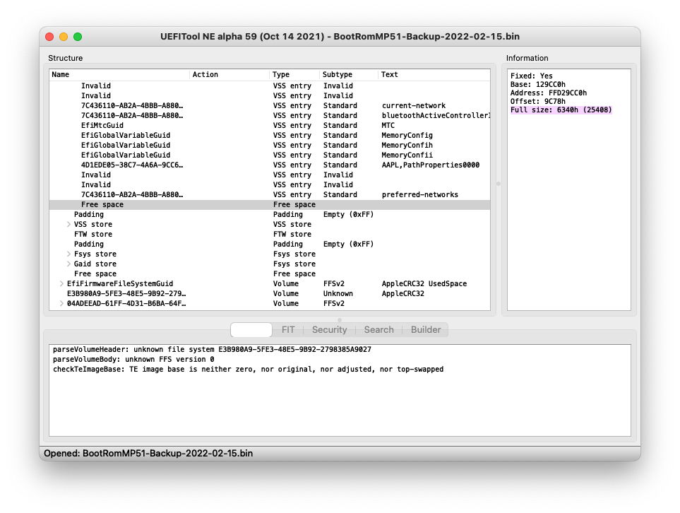 This dump below had two different failures, a corrupt circular log and failed garbage collection on primary VSS store where after the corrupt point the circular log was identified as padding, and the secondary VSS store completely trashed and not even being identified by UEFITool anymore. The owner of this early-2009 got it repaired in the nick of time before bricking it.