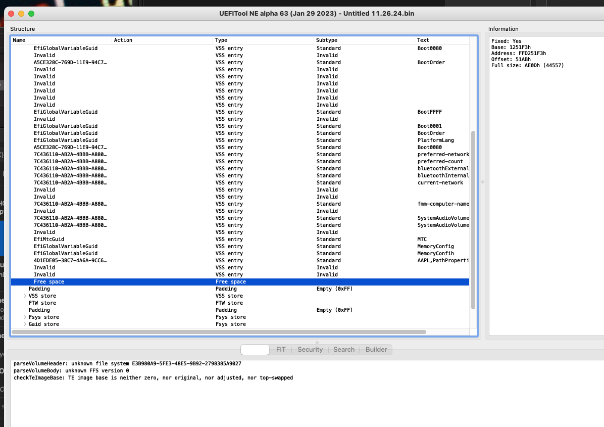 This dump below had two different failures, a corrupt circular log and failed garbage collection on primary VSS store where after the corrupt point the circular log was identified as padding, and the secondary VSS store completely trashed and not even being identified by UEFITool anymore. The owner of this early-2009 got it repaired in the nick of time before bricking it.