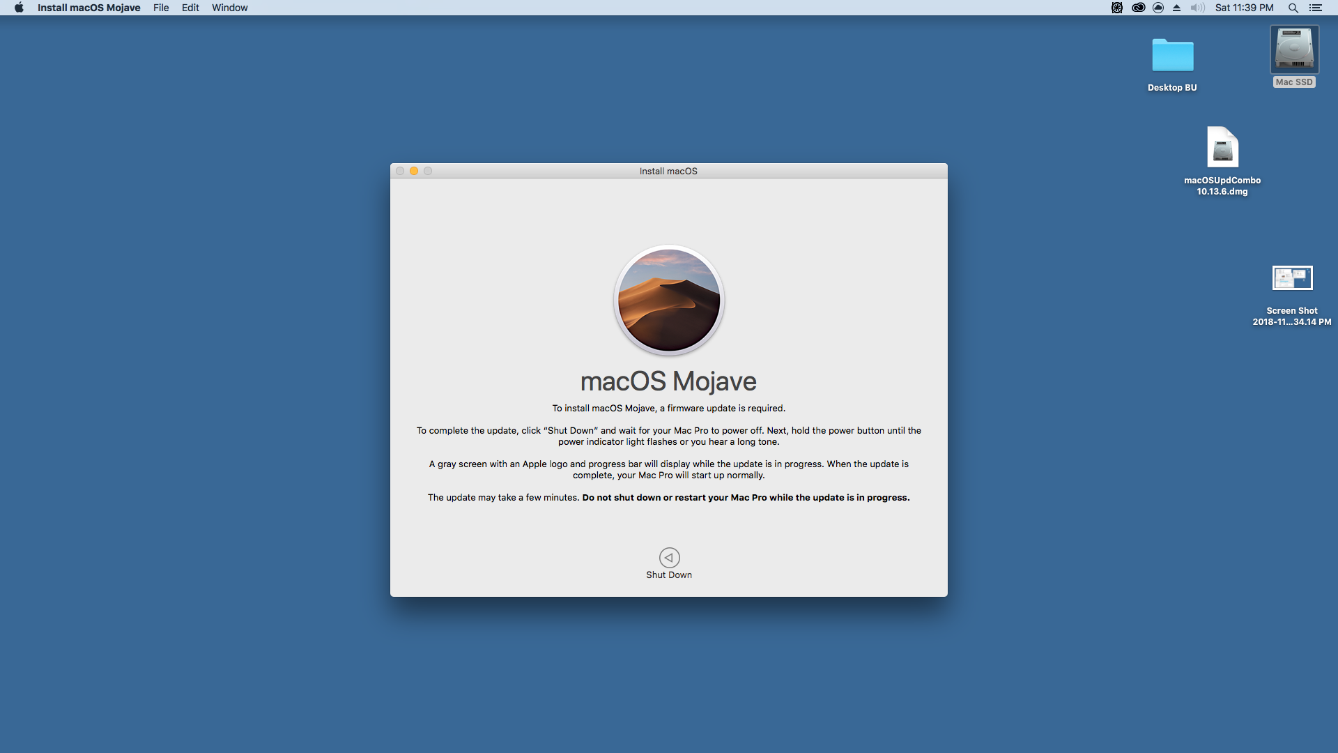 If I just run the Mojave installer it never initiates the shutdown after I enter the admin password for the helper app. It just sits there. If I gto ahead and shut it down and boot with the button down. The lights blink, I let go and the tone sounds. Then a normal reboot back to 10.13.6.