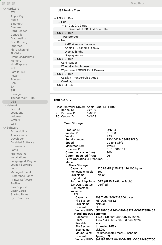 Voilà! Suddenly everything worked again - even the SanDisk Cruzer Glide mounted on the desktop properly, and my PIV badge reader (using a USB-C-to-USB-A adapter) worked as well. Back to being a happy camper.
