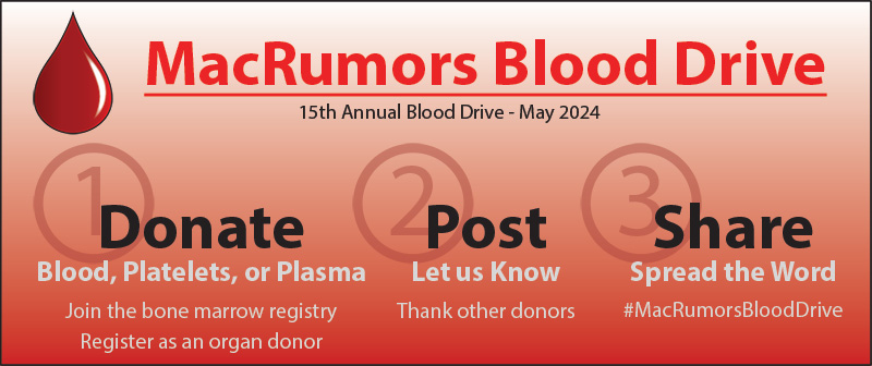 Fifteenth Annual MacRumors Blood Drive runs for the month of May 2024. If you are eligible, we ask you to donate blood, platelets, or plasma this month. Your donation will help other people survive or recover from injury, surgery, or illness (see the