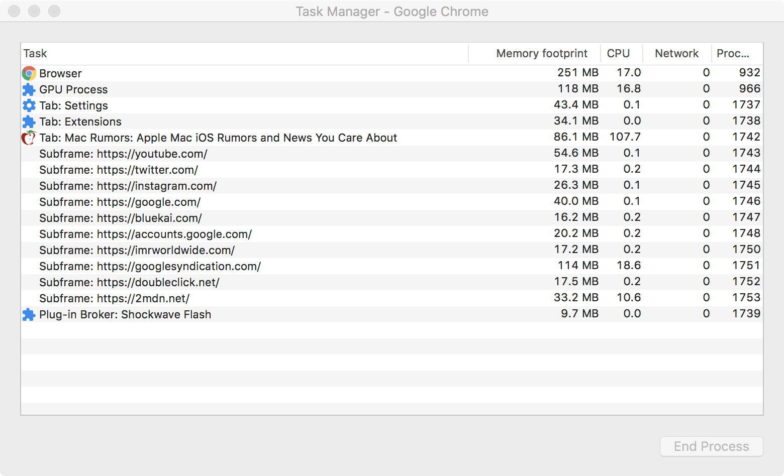 Using the Chrome Task Manager under "chrome menu" -> "More Tools" -> "Task Manager" I have found out that Macrumors.com is using >100% CPU. Even the Forum page that I am on right now typing this very post uses >100% CPU. I'm on a Mac OS X 10.13.5 and using Chrome Version 67.0.3396.62 (Official Build) (64-bit) which is the latest version.