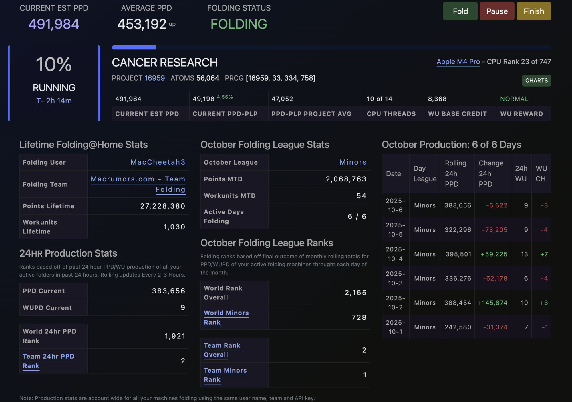 Just to update the forum, there is a small but hardy group of us that continue to contribute to the folding@home project under the Macrumors.com team (team number 3446). We're currently in the 123rd spot for all teams, but will likely move up a few places in the coming months, assuming that our production levels hold. If you have any computer cycles to spare, would love to have you join us. BTW, I'm folding using the version 8 Beta, which runs natively on Apple Silicon.