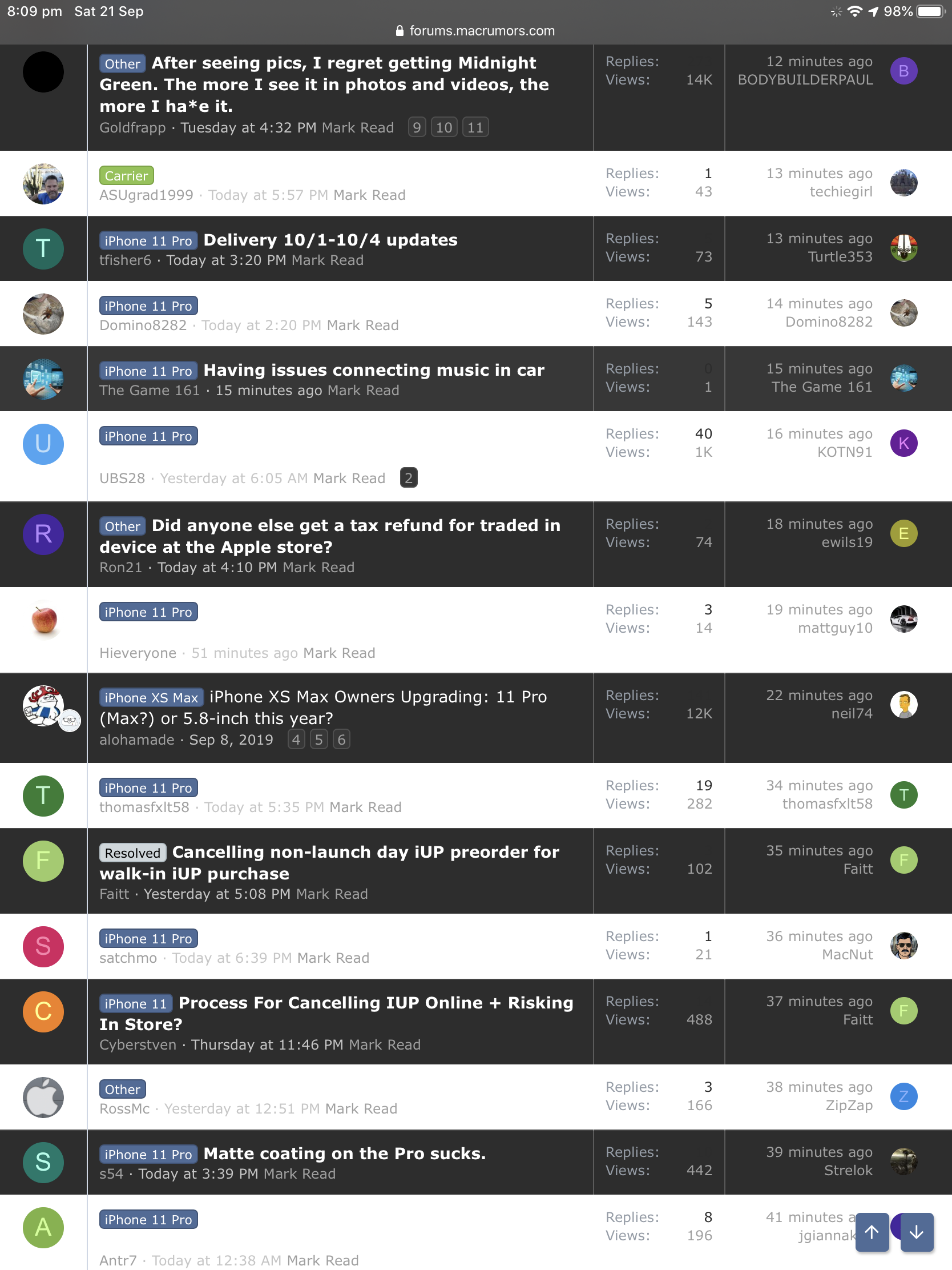 Sorry not sure if this is already reported, but couldn’t see it anywhere. When I exit Safari (i.e. go to the homescreen) whilst browsing the forums on my phone or iPad, when I go back to Safari there’s some bug where half the threads are dark and half light.