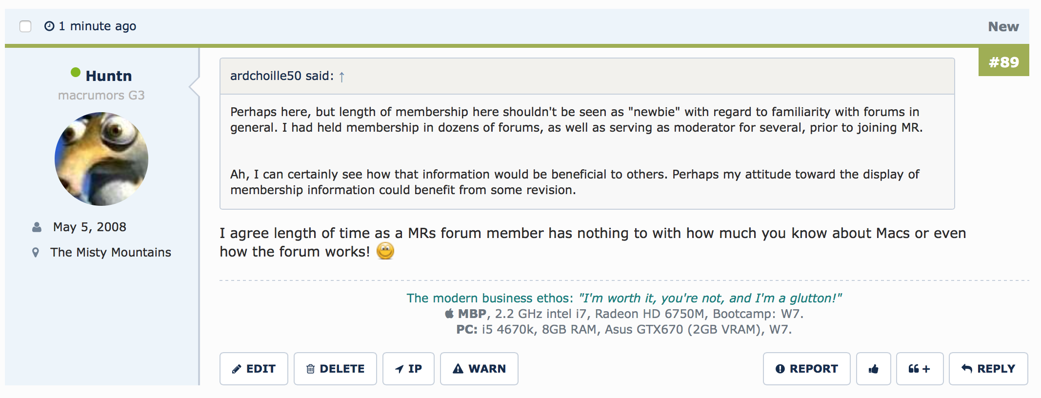 Actually, it can be somewhat indicative. If someone is new to the forum or has few posts, it may clue the reader to more carefully scrutinize the content of their posts, as their knowledge and experience is unknown. On the other hand, if someone has been around the forum for a long time and has a significant number of posts, it stands to reason that they're less likely to post inaccurate information.Being that length of membership is not indicative of post count, knowledge of Apple products or familiarity with XenForo, I don't quite understand how a length of membership statement is beneficial.