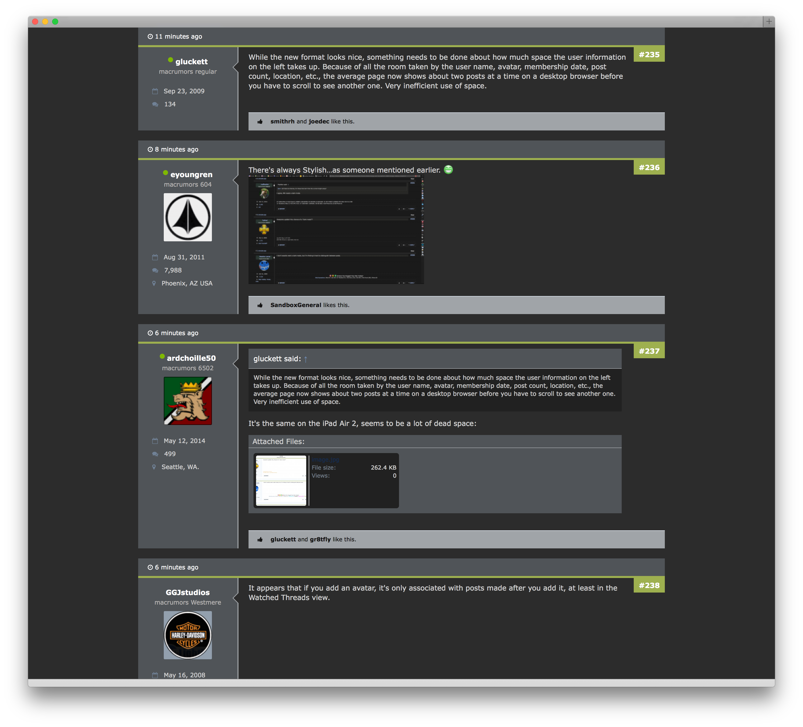 I usually dislike dark themes, but your example is very nice.. I could probably get used to something like that. I wish I knew how to change .CSS on my iOS devices.A little something I've been working onStill a work in progress though.View attachment 557319
