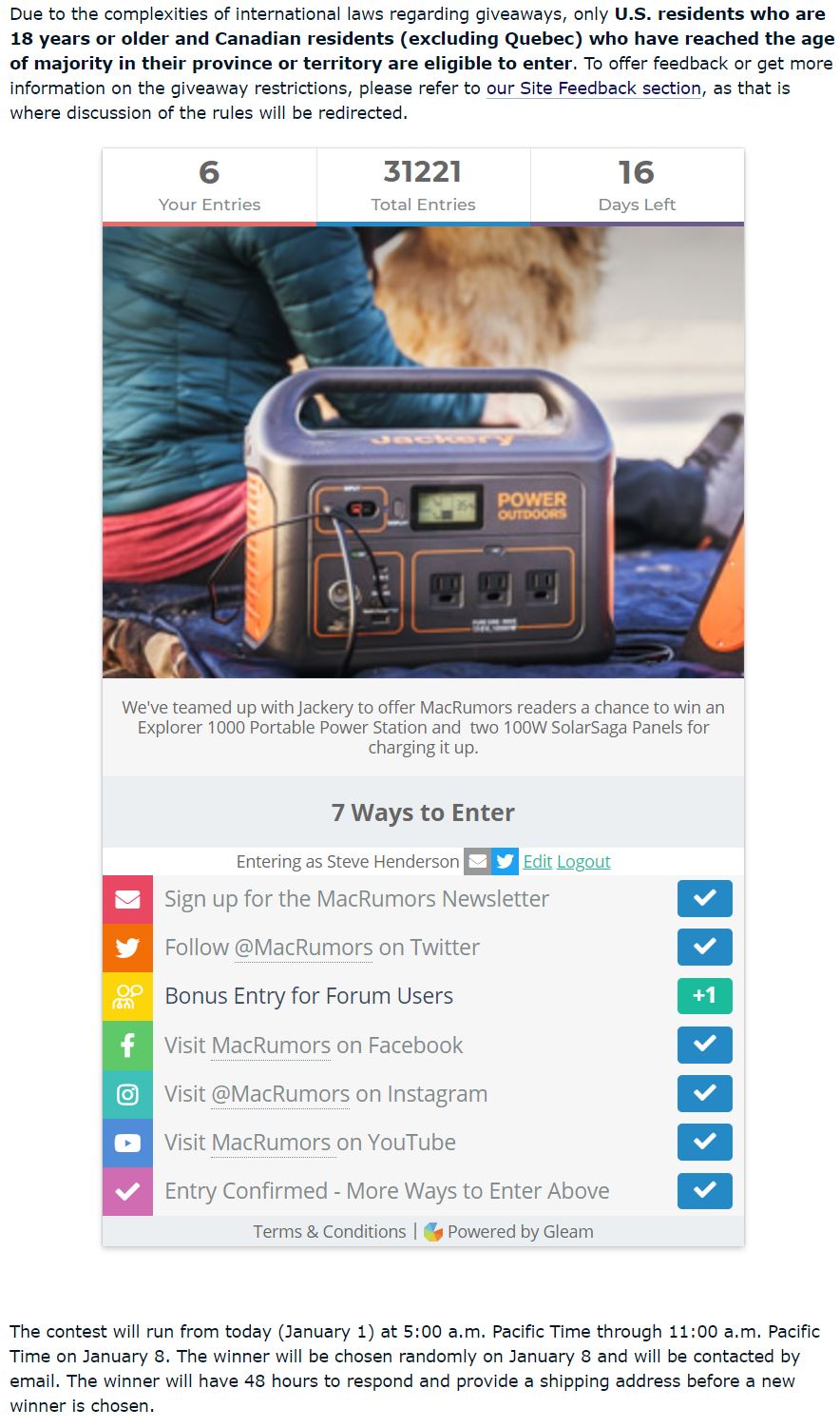 The contest page says there are 18 days left to enter. (It said 19 days earlier today, before 11:00 AM PST, I guess.)The contest will run from today (January 1) at 5:00 a.m. Pacific Time through 11:00 a.m. Pacific Time on January 8.