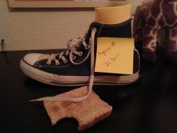 Sweet. Next challenge: Some object (knife, pencil, etc) stabbed through a cereal box, next to a blue t-shirt. Standard MR info required