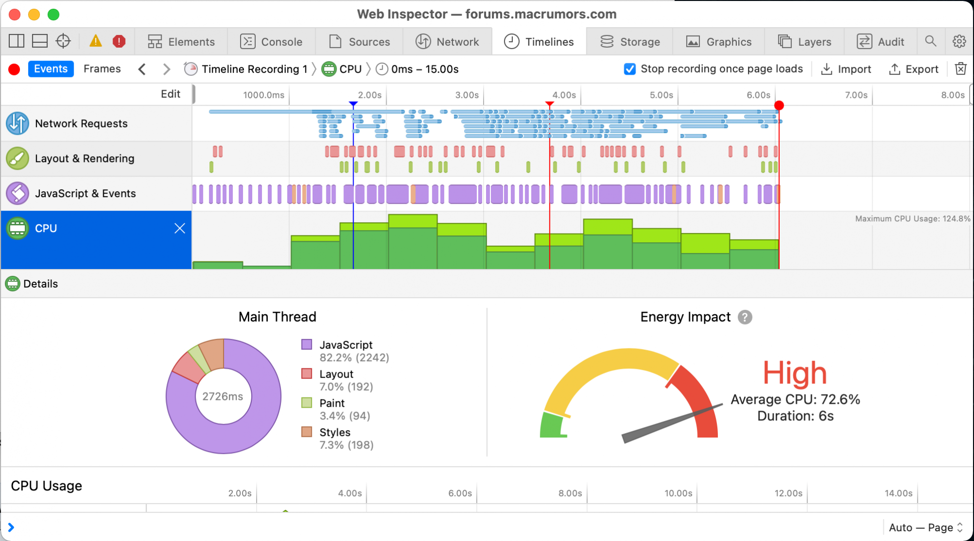 Yes, exactly.So you saw high cpu at the same time you only saw one debug triggered message per page load?