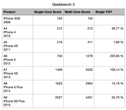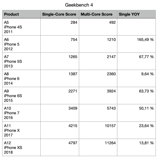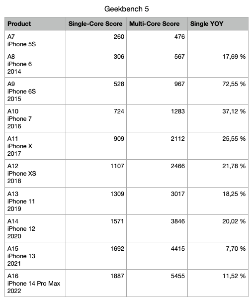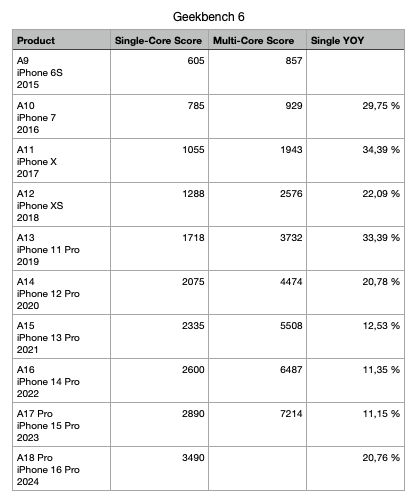 But we haven't seen anything in a while like, say, the A10, with 50%, the A9, with 64%, and the A6, with a whopping 166% (the A6 was the one that changed from ARM Cortex to an Apple design, so it's arguably the first "Apple Silicon").