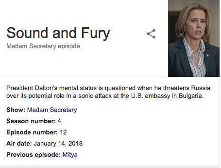 I wonder if that's the name that was given to the episode long ago or something that was done (or modified) recently. Almost like it's just a little too "on the nose".Madam Secretary Episode 12, season 4 "Sound and Fury", why is this so familiar, like I've heard it all before?