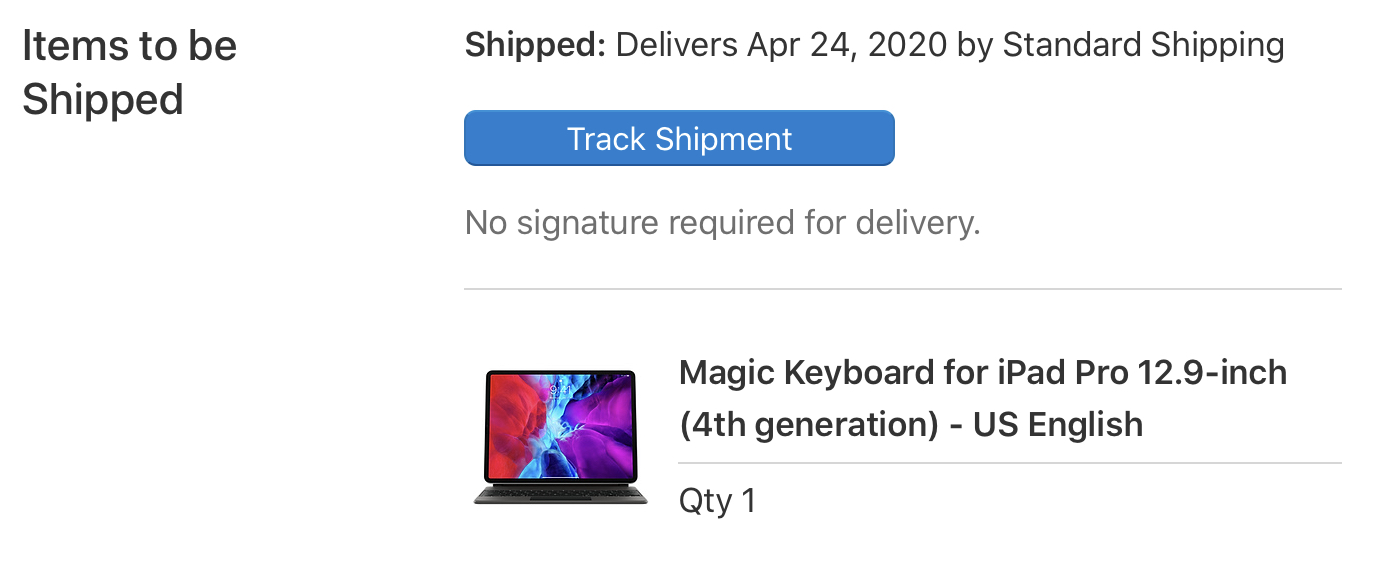 When I ordered my keyboard the only option was standard shipping (2-day). UPS has been showing - label created for the last 2 days with a 4/22 delivery (Apple shows Preparing for shipment). Apple just notified me that it has shipped and will delivery on 4/23 - so that would align with "standard" shipping.
