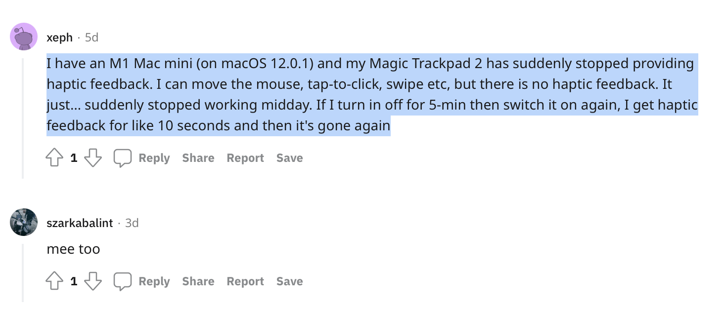 My Magic Trackpad 2 has suddenly stopped providing haptic feedback when I click it. I am on a iMac (27-inch, 2019) running Monterey 12.0.1