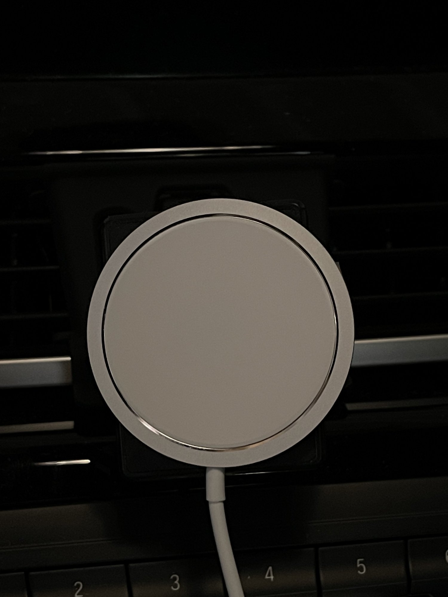So finally received my third-party knockoff of MagSafe Charger ordered from Aliexpress. My setup is a magnet mount which I had placed the Apple MagSafe charger on (see photo) and then mounted my 12 ProMax with leather case to it. This worked well and was very secure when driving.