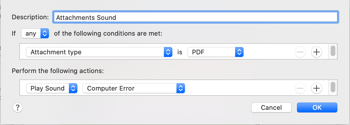 3. I have tried setting up a rule for attachments with a name containing "." (or ending in ".pdf" or even as PDF attachment for examples as a test to play a sound and/or change the background color (as a workaround).