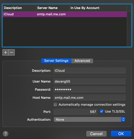 Error message is: "The connection to the server "smtp.mail.me.com" on port 587 timed out."