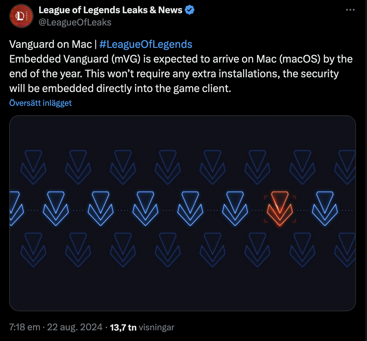 Can LoL currently tell if you are running the game without the default macOS security features turned on?I got confused at first but they use Vanguard for League of Legends too so that's why they're making Embedded Vanguard (mVG) for Mac.