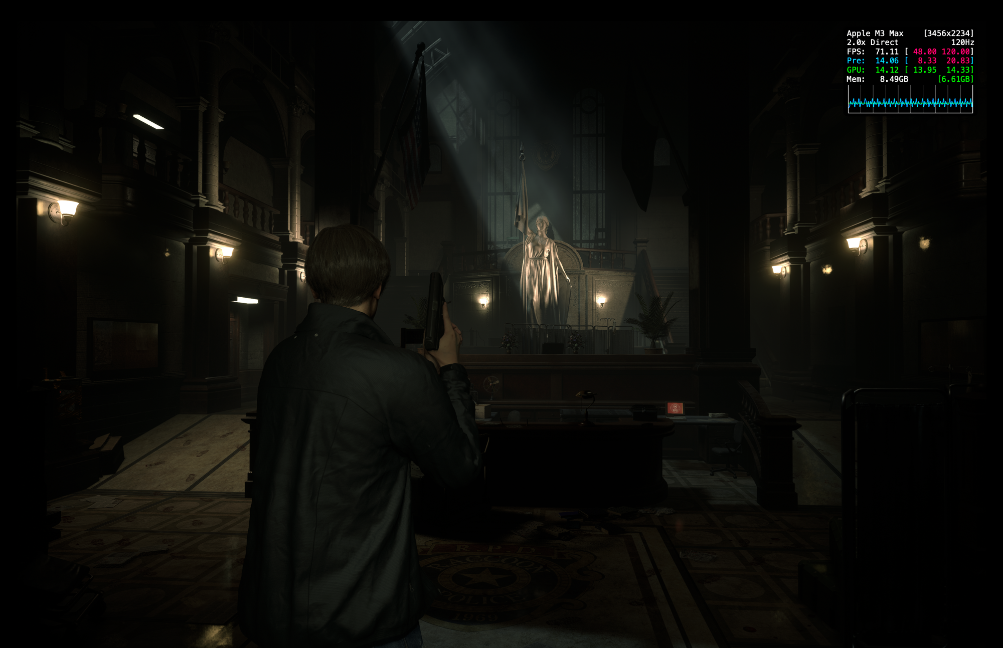 On my M3 Max 16" base with binned GPU, with 16" internal screen native res, upscale MetalFX quality, every other settings at max, FPS is at stable 70. Game feels even better optimized than RE4, but there are still smearing and tearing here and there. HDR effects on the MBP XDR screen is pretty nice. Will try it on an OLED TV later.