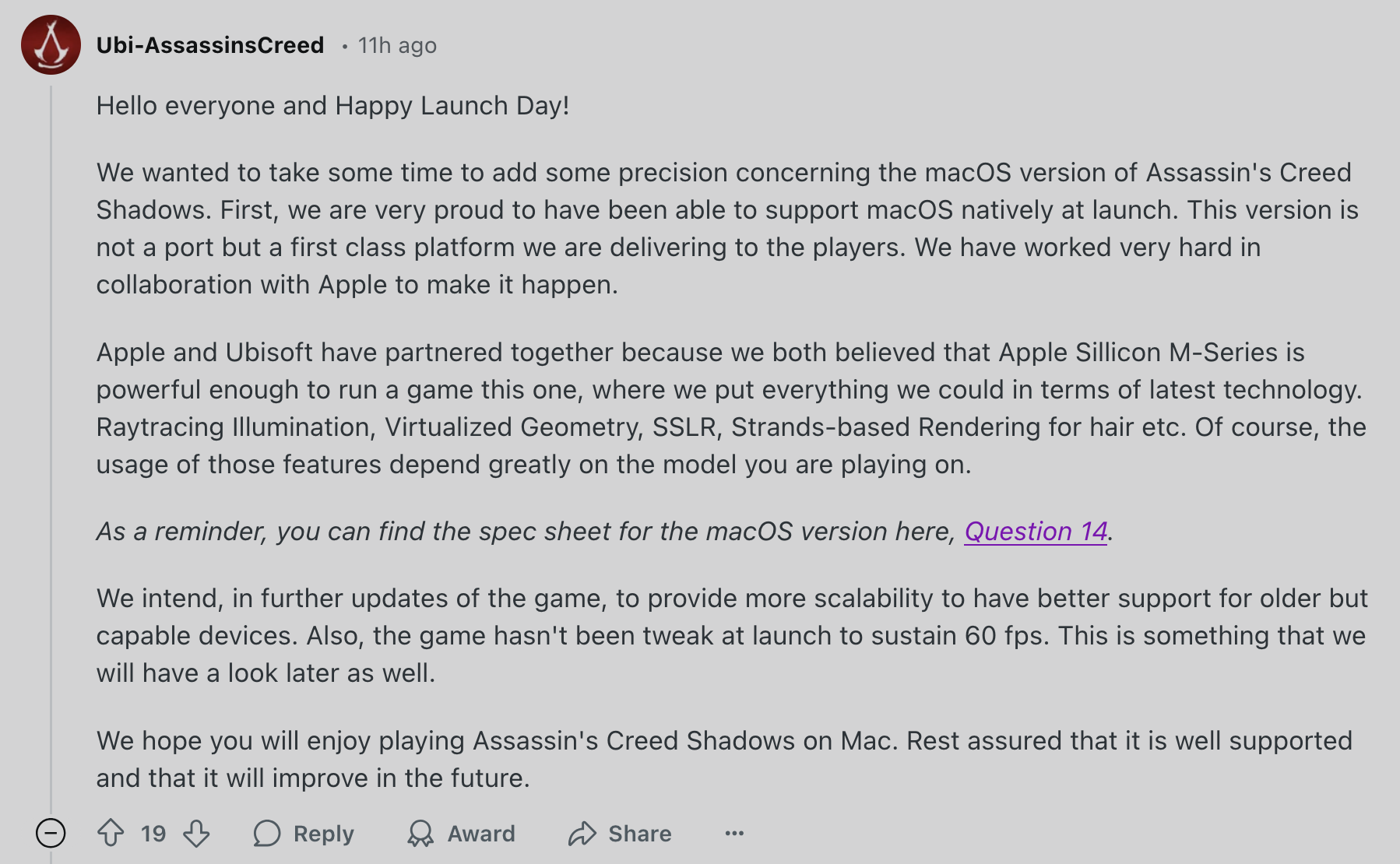 I didn’t want to say anything on AC Shadows because of all the negative press around it, and Mac fans need anything we can get, but this is what I expected from Ubisoft.