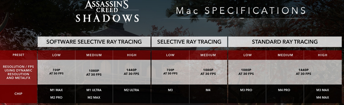 Looking on Ubisoft's site, and it appears that ray tracing is the cause of the performance differences between Macs and PCs. If you want selective ray tracing you can "get away with" a M1 or M2, if you want to use standard ray tracing, then you need a M3 or M4 - and then in both cases you only get 30fps - this of course is prior to ultra-low preset update.