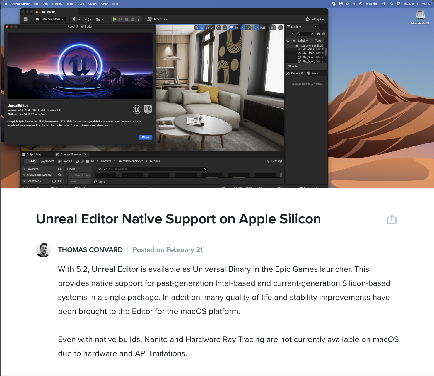 Wait, I thought Apple fixed the Nanite issue with Metal 3?Unreal Engine 5.2 has now native support for Apple Silicon. "Nanite and Hardware Ray Tracing are not currently available on macOS due to hardware and API limitations."