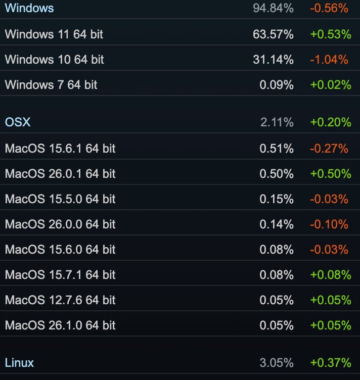 Linux has proton. So they get to use the native client to play windows games. The same can't be said for MacOS.Here's what the survey is showing windows, mac and linux