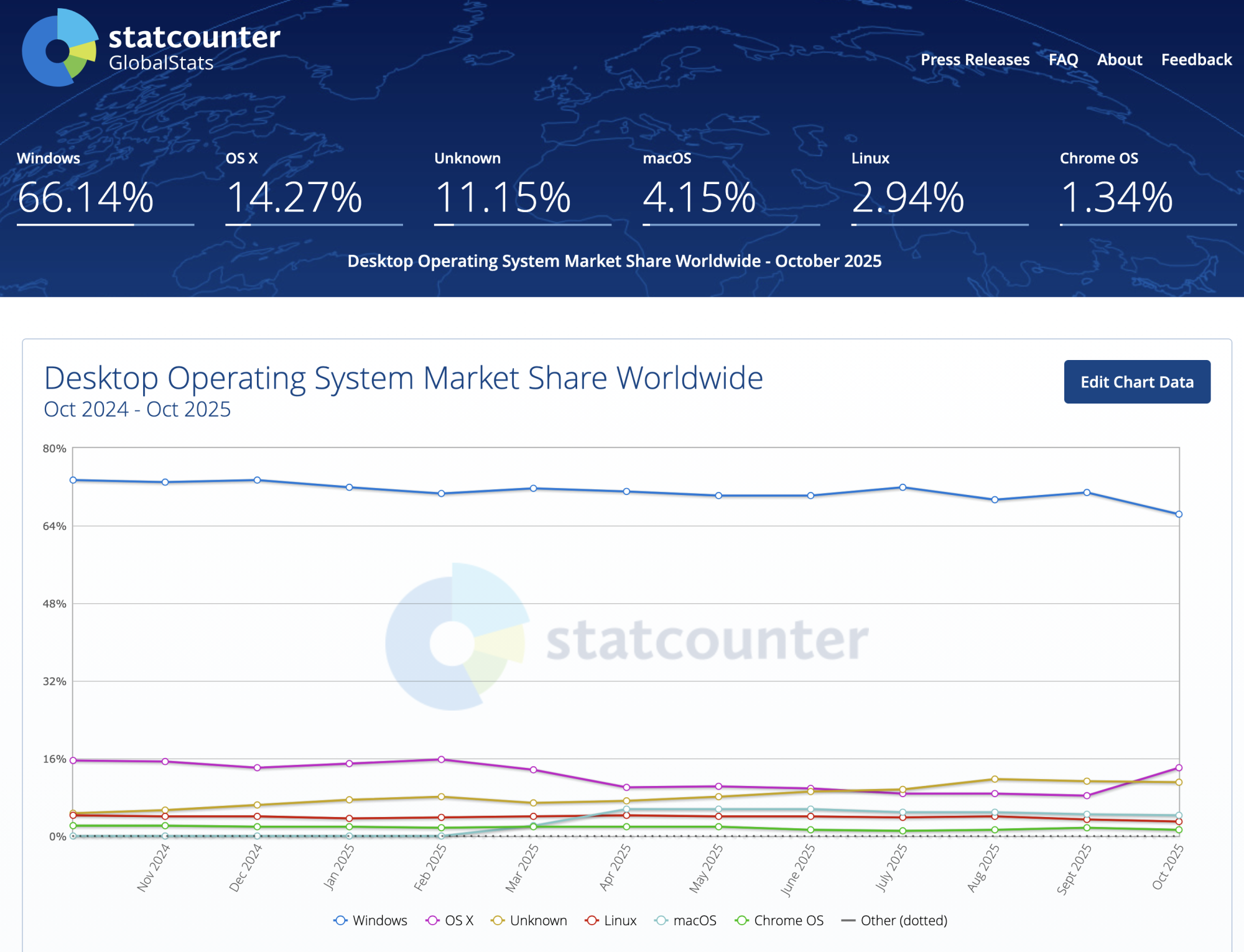 That’s probably accurate considering we’re likely to see an increase in Linux usage due to w10 going EoL and plenty of disdain for w11. (And switching to Linux doesn’t require buying a new PC)Here's what the survey is showing windows, mac and linux