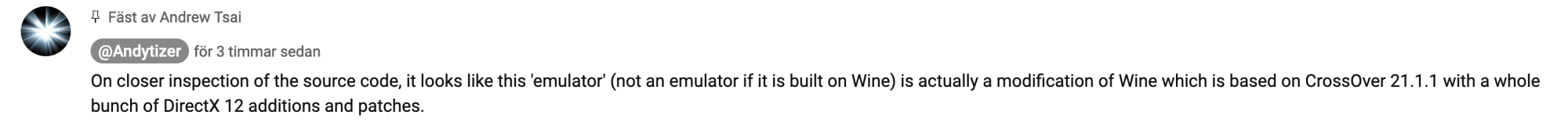 So I have a question then: If it's Wine but with DirectX 12, could we use this ourselves for existing Windows games and get them running right now? Because if so, then that would be big and essentially means CrossOver got Sherlocked. It could potentially mean Steam Proton could come back to Mac as well