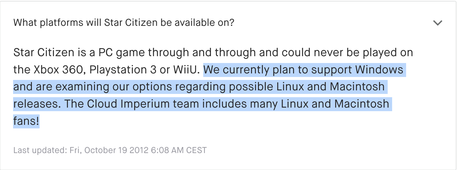 Kickstarter page "We currently plan to support Windows and are examining our options regarding possible Linux and Macintosh releases. The Cloud Imperium team includes many Linux and Macintosh fans!" but on their