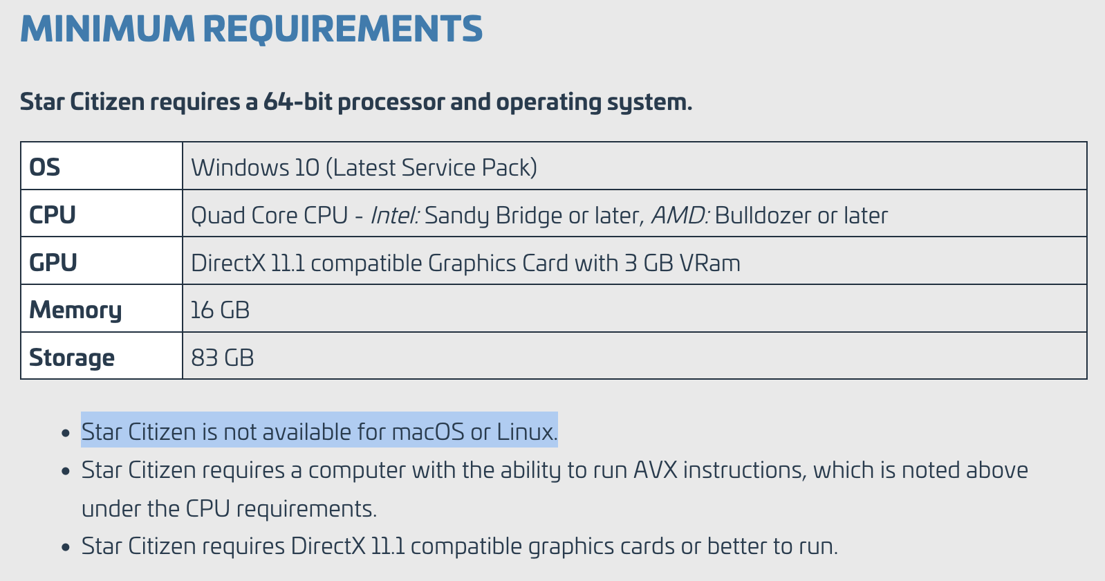official web site updated two months ago they say "Star Citizen is not available for macOS or Linux", maybe due to lack of AVX support on Mac. Apple