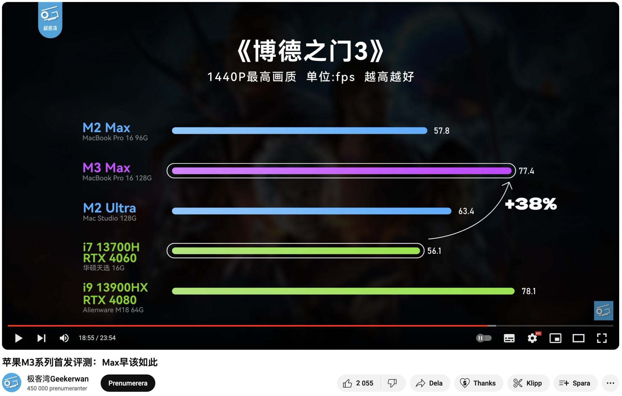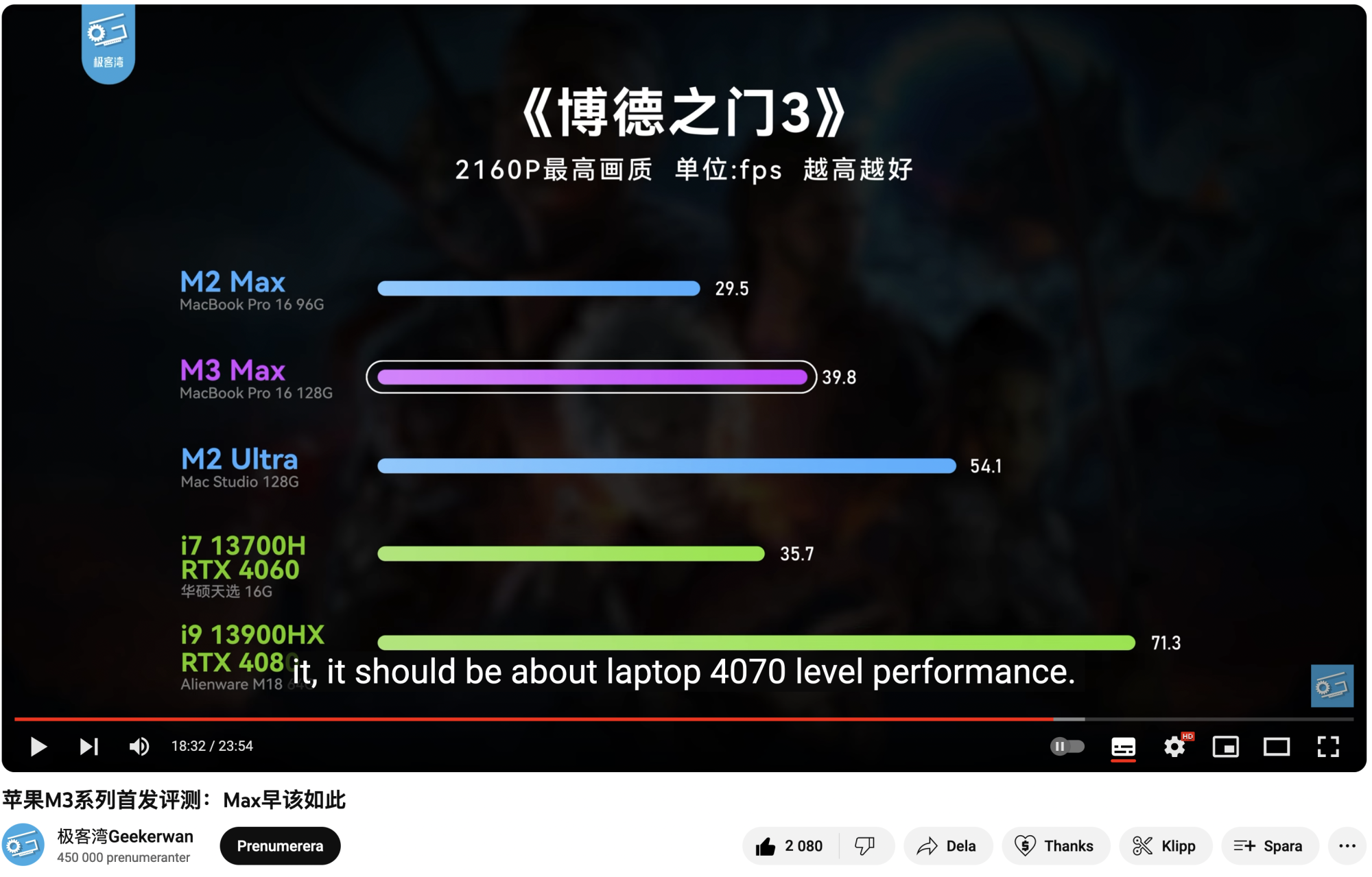 Based on the scaling it appears the 4080 may be still CPU bound at 1440p. 4k is like 2 times as many pixels as 1440p but the 4080 only lost 8 frames.Very interesting gaming test in Badur's Gate 3 which is native for AS. People keep saying M2 Ultra isn't better than RTX 4060 in games. Here we see a different story.
