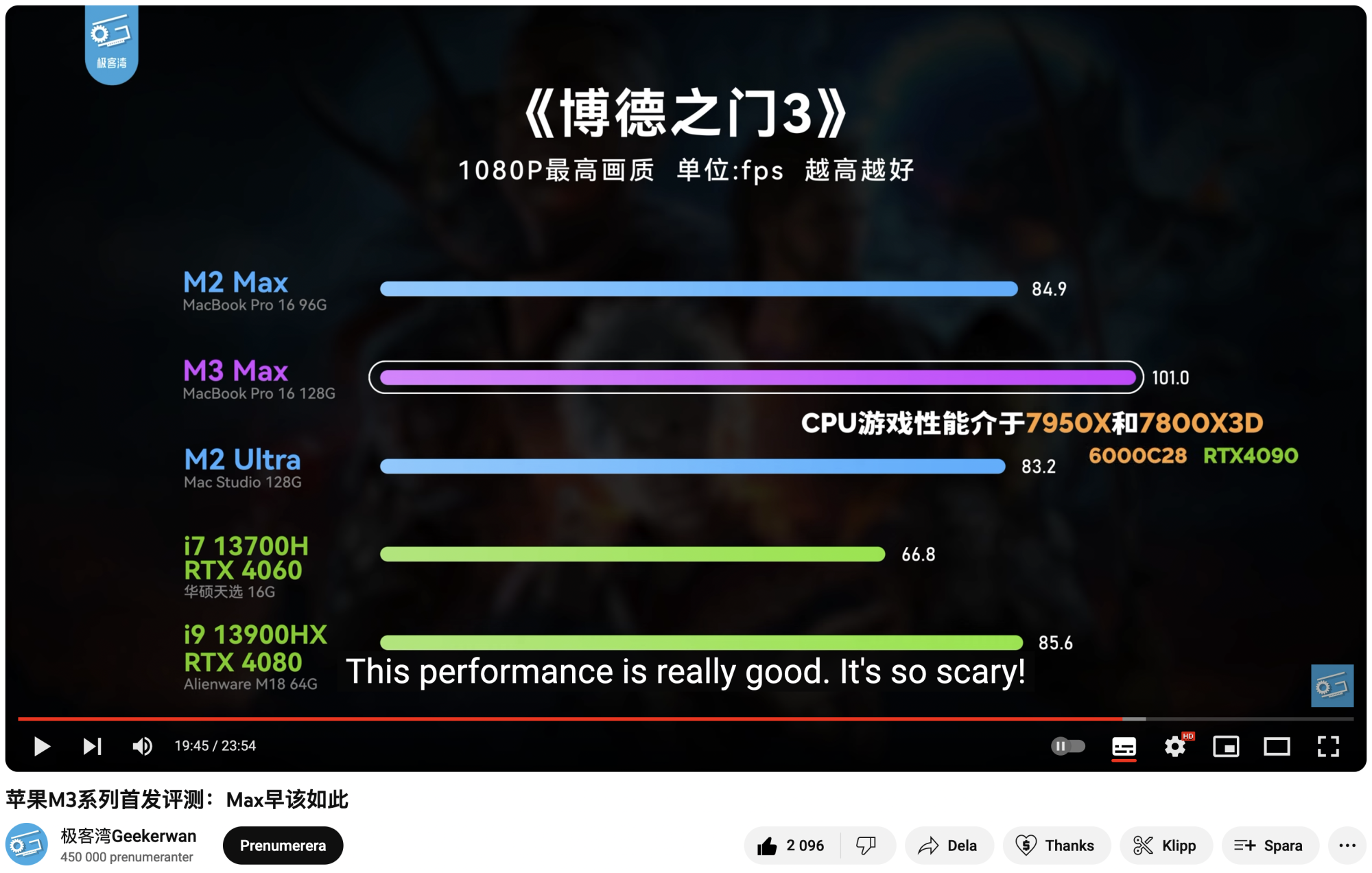 At 1080p max quality when the game is CPU bound M3 Max performs as the best gaming laptops with the fastest memory and RTX 4090.