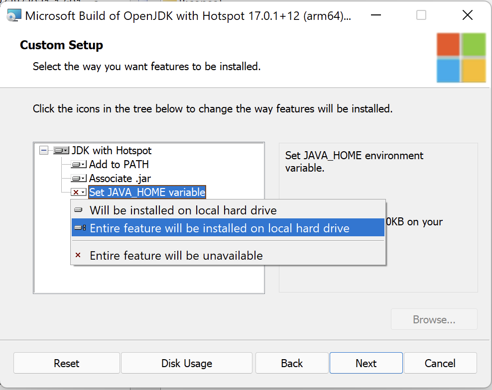2, you indeed must stick with OpenJDK 11 available at https://download.visualstudio.micro...microsoft-jdk-11.0.13.8.1-windows-aarch64.msi (linked from https://docs.microsoft.com/en-gb/java/openjdk/download#openjdk-11 ). Install it. WARNING: during installation, it will NOT automatically set JAVA_HOME (there will be a red X in the “Set JAVA_HOME variable”) - just right-click it and select “Entire…” as in the attached screenshot.