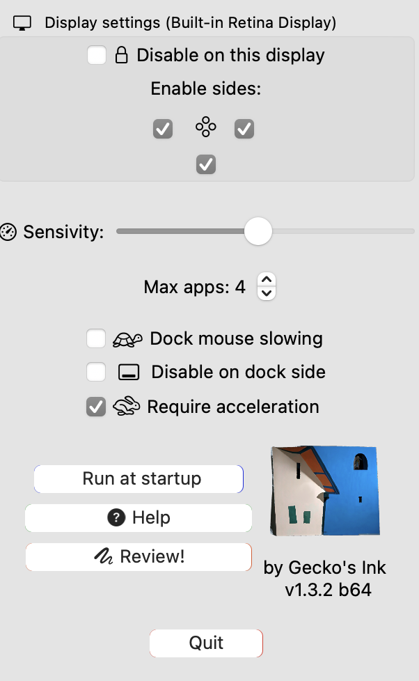 The buttons them selves "Run at Startup" and "Review" "Quit" should follow other button designs laid out by Apple. I don't know why there's a color on the right-hand side on those.. could just be my installation of Monterey?!