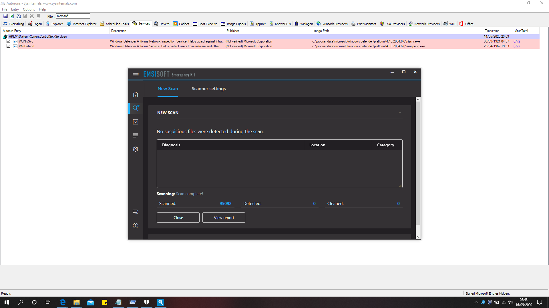 As you can see, Autoruns detects some unverified processes in WinDefend and WdNisSvc. Look at the timestamps of the software specifically: 1921 and 1967. I cannot disable these either, as when I do, it states Access is Denied.