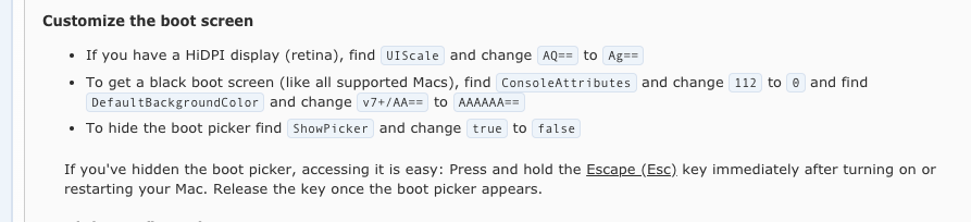 Yes, I will follow the first message and can do the installation. I mean first page is very basic and usefull but last pages are experimental/advanced and fragmented such as deleting bootx64.efi, staying in bootloop, graphic bootscrens or what to do if the oc configuration is broken (the requirement of faq is mentioned upper). Experimental config strings, updated methotds or solution methods spoken in the different pages and solving the problems of the users are not found on the first page. These solutions have always been lost on the intermediate pages. New inexperienced users can not find it easy like me. For example I would not know, if h9826790 was not share 0.5.9 package's nvram options in config.plist and OpenCanopy for 0.5.9.