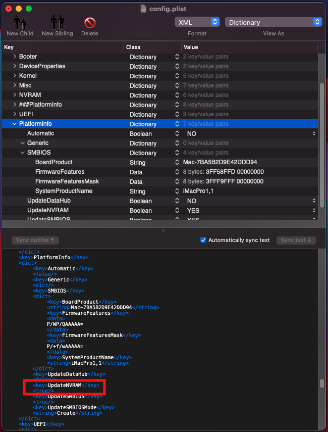See here update NVRAM is true but PlatformNVram is not defined. Here is a one liner to quickly check most of the parameters needed for iMessage:
