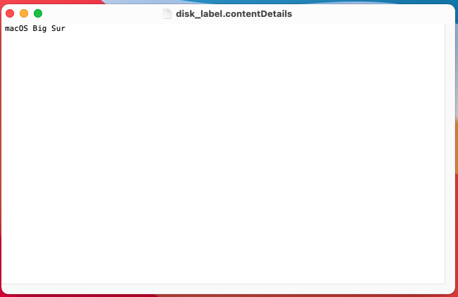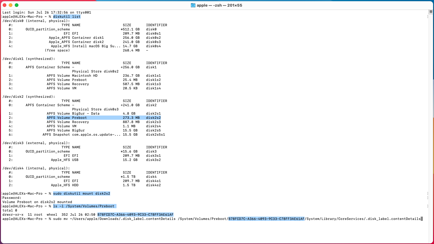 Code:Last login: Sun Jul 26 17:32:56 on ttys001 apple@ALEXs-Mac-Pro ~ % diskutil list /dev/disk0 (internal, physical): #: TYPE NAME SIZE IDENTIFIER 0: GUID_partition_scheme *512.1 GB disk0 1: EFI EFI 209.7 MB disk0s1 2: Apple_APFS Container disk1 256.0 GB disk0s2 3: Apple_APFS Container disk2 241.0 GB disk0s3 4: Apple_HFS Install macOS Big Su... 14.7 GB disk0s4 (free space) 268.4 MB - /dev/disk1 (synthesized): #: TYPE NAME SIZE IDENTIFIER 0: APFS Container Scheme - +256.0 GB disk1 Physical Store disk0s2 1: APFS Volume Macintosh HD 236.7 GB disk1s1 2: APFS Volume Preboot 25.4 MB disk1s2 3: APFS Volume Recovery 507.5 MB disk1s3 4: APFS Volume VM 20.5 KB disk1s4 /dev/disk2 (synthesized): #: TYPE NAME SIZE IDENTIFIER 0: APFS Container Scheme - +241.0 GB disk2 Physical Store disk0s3 1: APFS Volume BigSur - Data 4.8 GB disk2s1 2: APFS Volume Preboot 273.3 MB disk2s2 3: APFS Volume Recovery 887.8 MB disk2s3 4: APFS Volume VM 1.1 MB disk2s4 5: APFS Volume BigSur 15.5 GB disk2s5 6: APFS Snapshot com.apple.os.update-... 15.5 GB disk2s5s1 /dev/disk3 (external, physical): #: TYPE NAME SIZE IDENTIFIER 0: GUID_partition_scheme *15.6 GB disk3 1: EFI EFI 209.7 MB disk3s1 2: Apple_HFS USB 15.2 GB disk3s2 /dev/disk4 (internal, physical): #: TYPE NAME SIZE IDENTIFIER 0: GUID_partition_scheme *1.5 TB disk4 1: EFI EFI 209.7 MB disk4s1 2: Apple_HFS HDD 1.5 TB disk4s2 apple@ALEXs-Mac-Pro ~ % sudo diskutil mount disk2s2 Password: Volume Preboot on disk2s2 mounted apple@ALEXs-Mac-Pro ~ % ls -l /System/Volumes/Preboot total 0 drwxr-xr-x 11 root wheel 352 Jul 26 02:50 B78FCD7C-A366-4093-9C33-C78FF3AE61AF apple@ALEXs-Mac-Pro ~ % sudo mv ~/Users/apple/Downloads/.disk_label.contentDetails /System/Volumes/Preboot/B78FCD7C-A366-4093-9C33-C78FF3AE61AF/System/Library/CoreServices/.disk_label.contentDetails