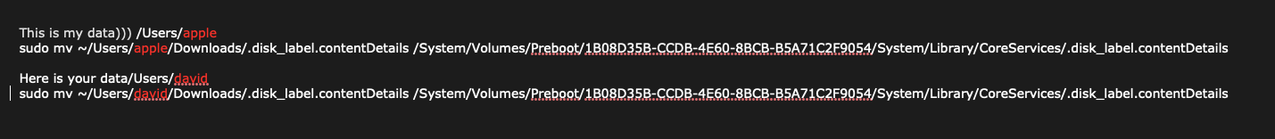 mv: rename /Users/david/Users/apple/Downloads/.disk_label.contentDetails to /System/Volumes/Preboot/1B08D35B-CCDB-4E60-8BCB-B5A71C2F9054/System/Library/CoreServices/.disk_label.contentDetails: No such file or directory